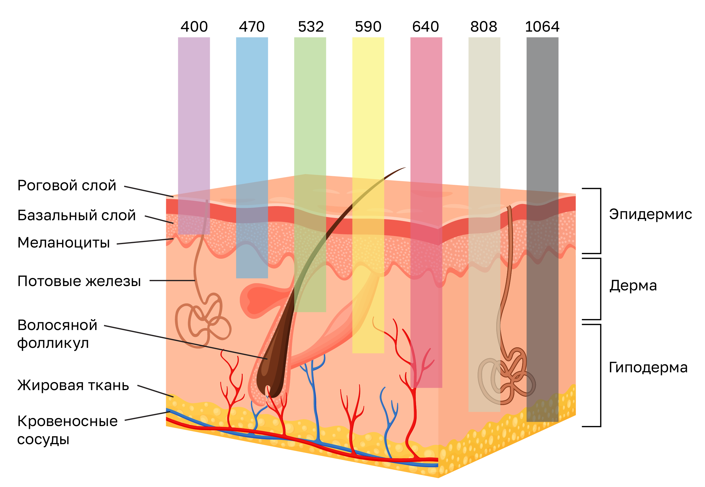 Длина волны влияет на глубину проникновения излучения в биологическую ткань и на характер его взаимодействия с тканью. От длины волны зависит, какая структура ткани будет разрушена. Для излучения с длиной волны 808 нм целевой структурой является меланин, который содержится в волосе. Воздействие на меланин обеспечивает разрушение волоса и эффект лазерной эпиляции.