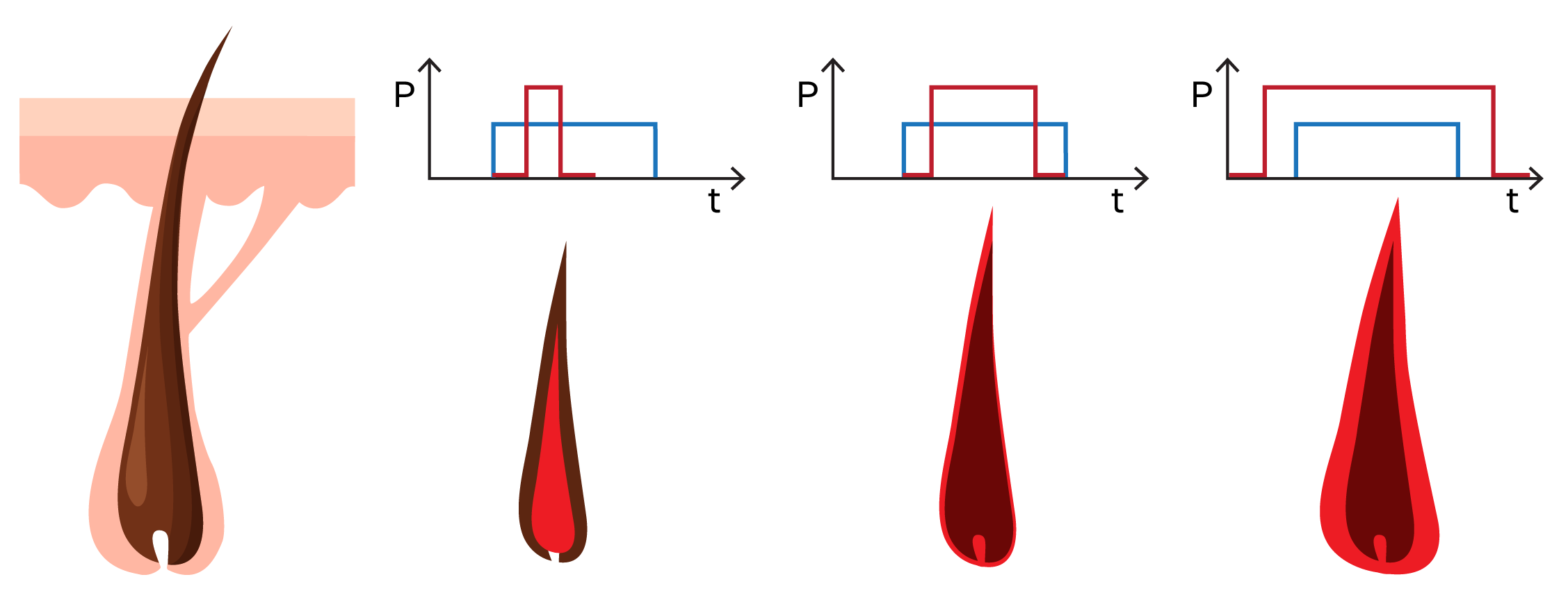 Длительность импульса должна выбираться сравнимой с временем термической релаксации (TRT) целевой структуры, т.к. в этом случае достигается максимально эффективный объемный нагрев целевой структуры. В случае лазерной эпиляции – это волосяной фолликул (TRT=10-50 мс) и ствол волоса (TRT=3-5 мс). В лазерных системах Magic установлена подходящая длительность импульса, которая не перегревает ткани.